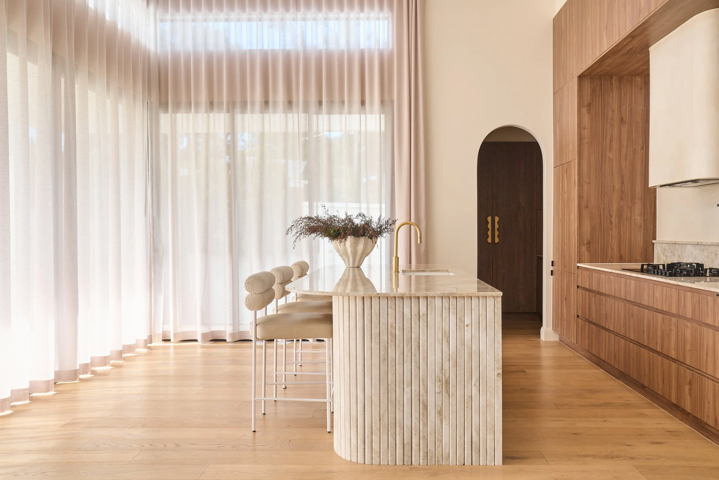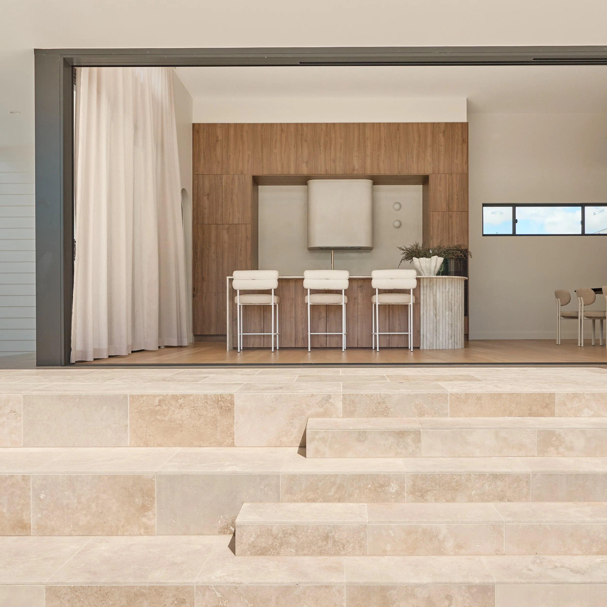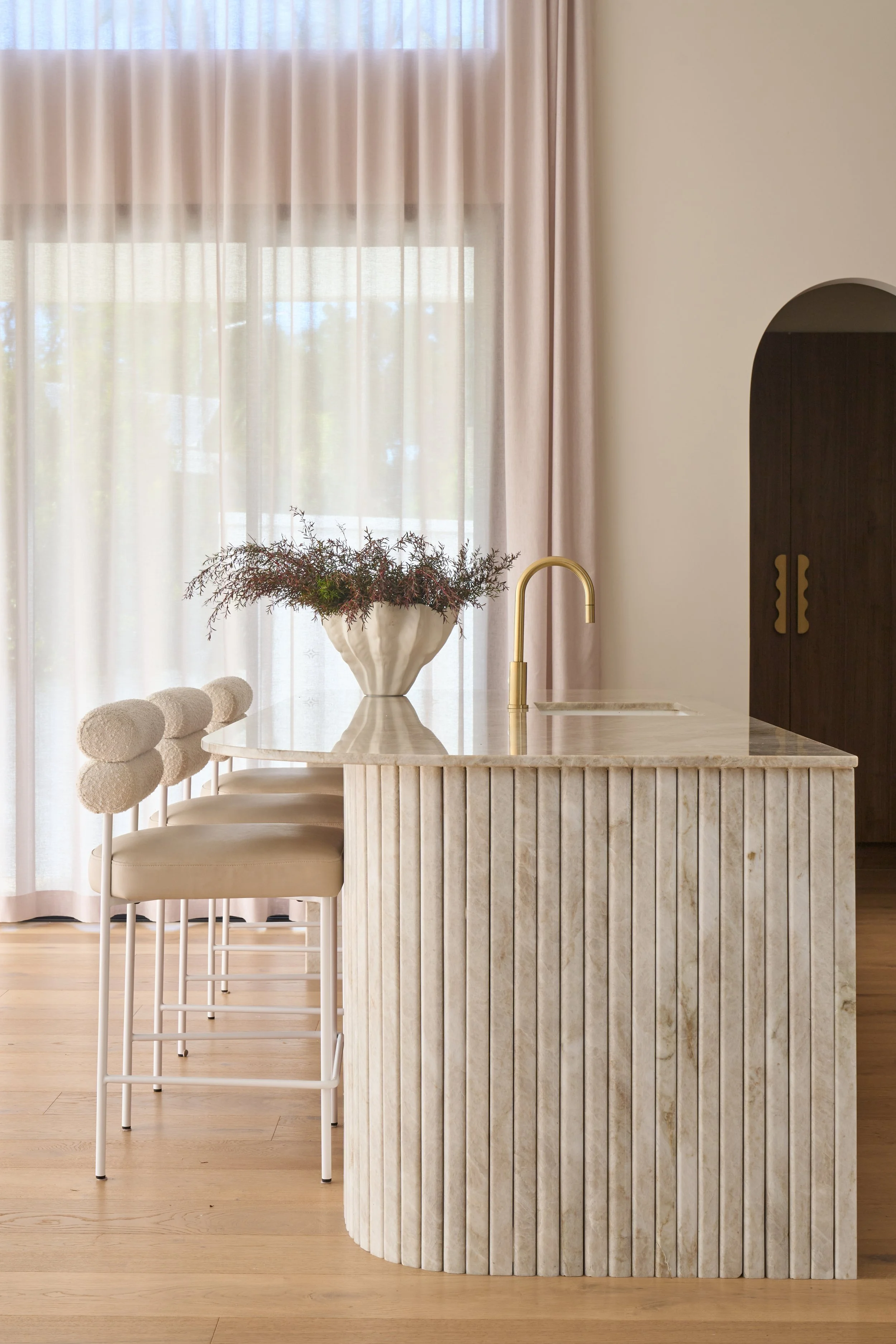 Natural stone tiles sit alongside Taj Mahal quartzite benchtops, grounding the interior in a quiet, organic palette. Each finish has been considered in relation to the next, creating a sense of cohesion without overstatement.