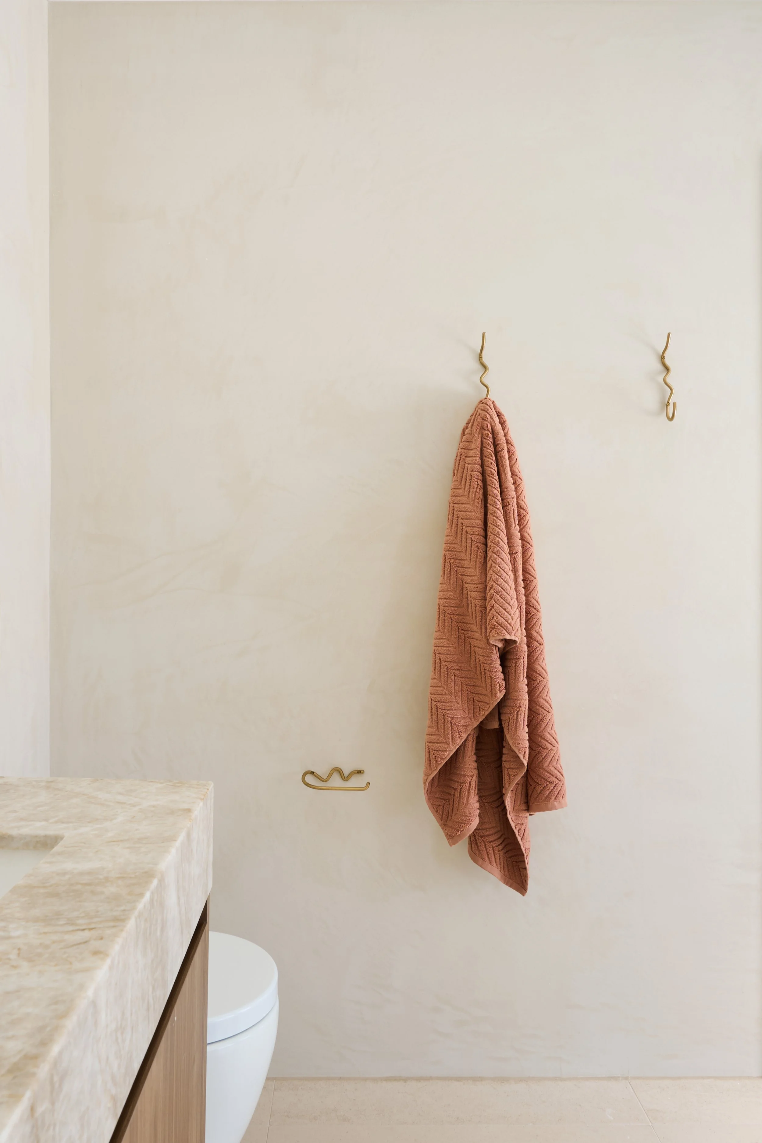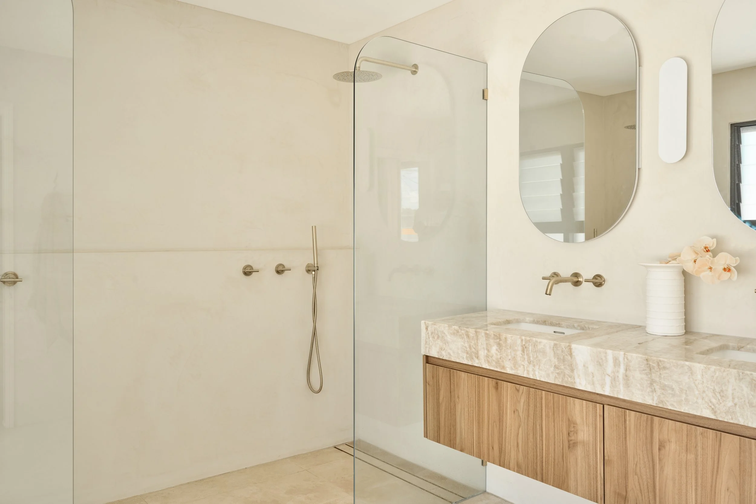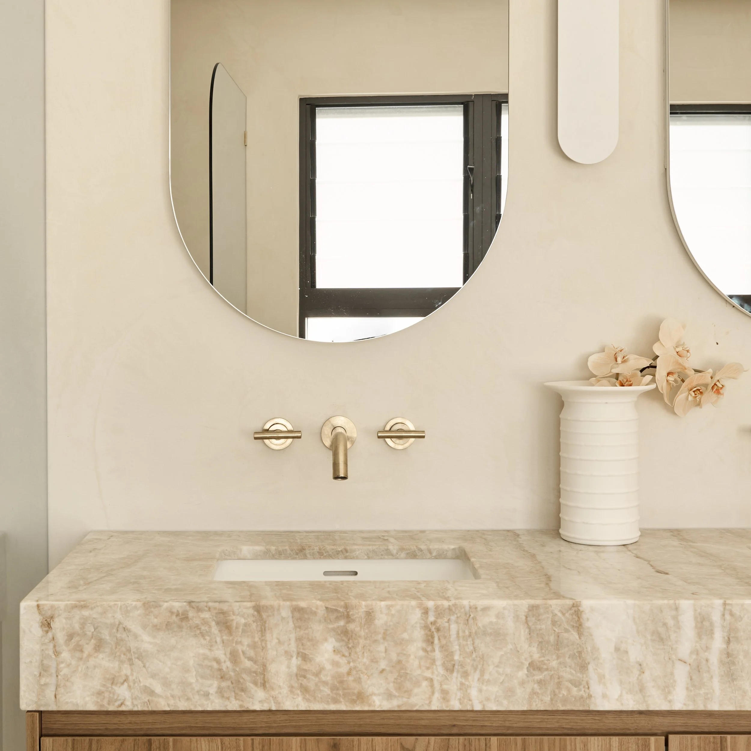 Walnut cabinetry anchors the space, paired with brushed brass fixtures to introduce a subtle warmth. Venetian plaster walls add a soft, textural layer, shifting gently with the light throughout the day.